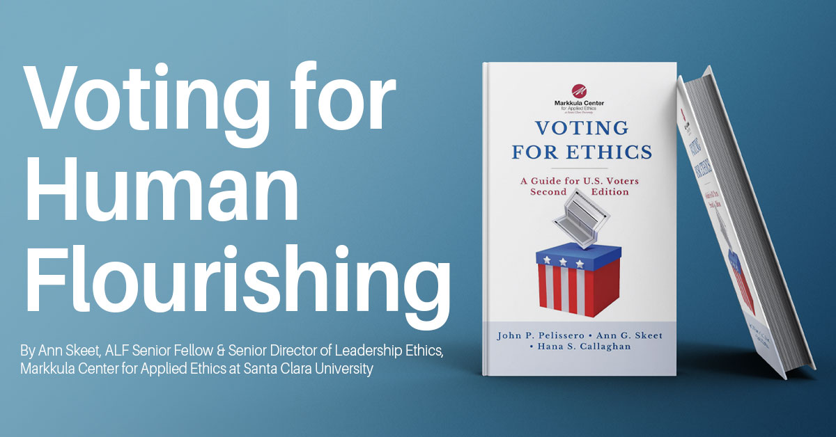 Ann Skeet is the Senior Director of Leadership Ethics at the Markkula Center for Applied Ethics at Santa Clara University, an ALF Senior Fellow from Class X, and served as the organization’s CEO from 2000-2008. She is a co-author of Voting for Ethics: A Guide for U.S. Voters Second Edition and Ethics in the Age of Disruptive Technologies: An Operational Roadmap. Views are her own.